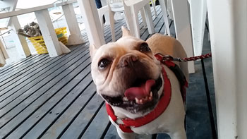 そして散歩のおしまいは、海の家・NOANOA。プーリーとドゥージーに引っ張られて入っていく私たちに、なにもいわずとも大きなボウルの犬水と生ビールが出てくる。グループ客などで混んでいるときには、予約席の札と共に1席用意されている。この常連扱いの気分のよさ。