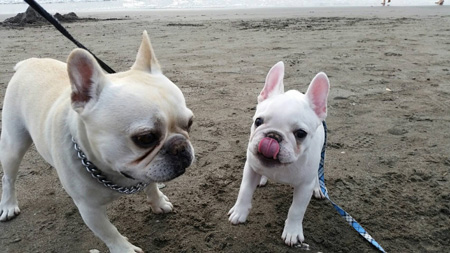 まだまだ明るい夕刻、プーリーとドゥージーを連れて浜に出る。